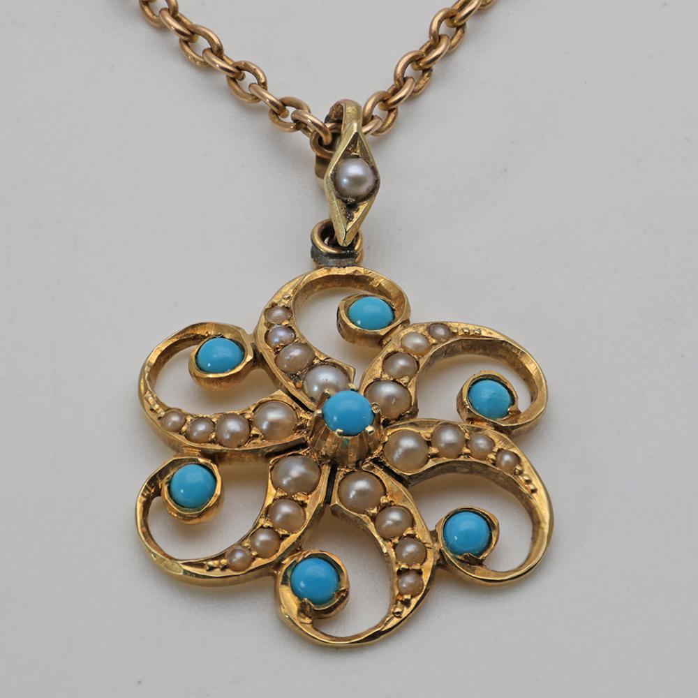 15ct Gold Victorian Pendant & Chain with Pearls & Turquoise