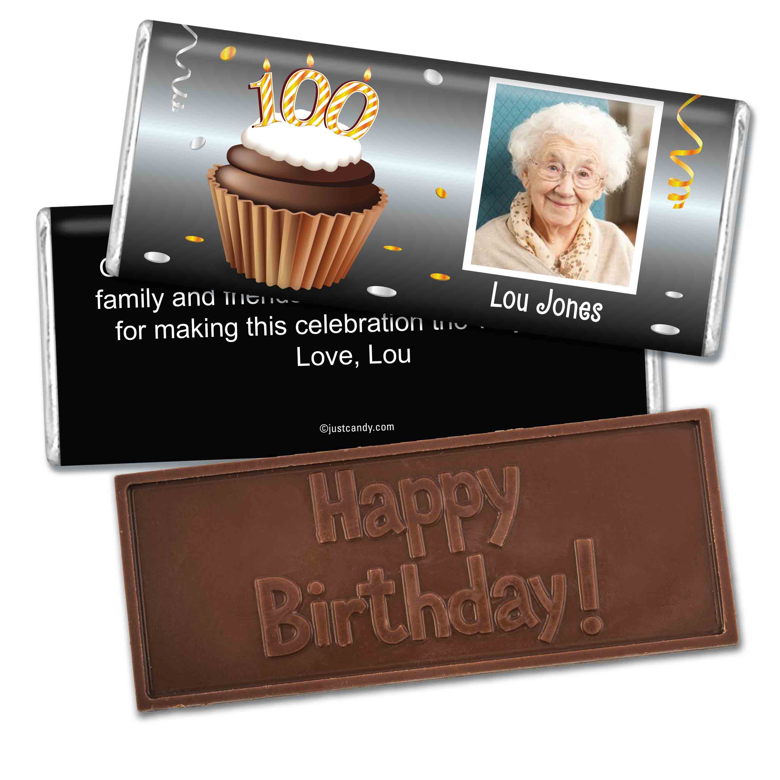 100th Birthday Personalized Embossed Chocolate Bar Cupcake & Year Photo