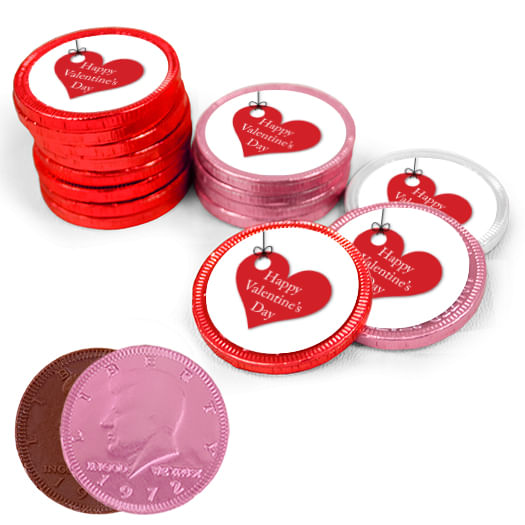 Valentine's Day Hanging Hearts Milk Chocolate RedPink and White Coins with Stickers (84 Pack)