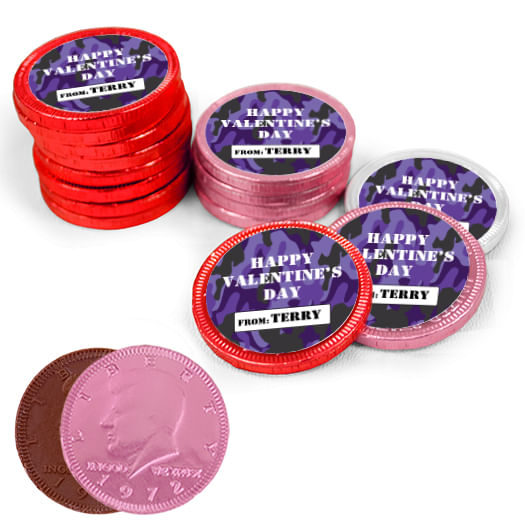 Valentine's Day Camo Milk Chocolate RedPink and White Coins with Stickers (84 Pack)