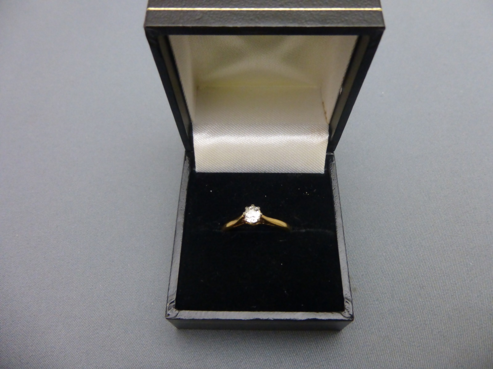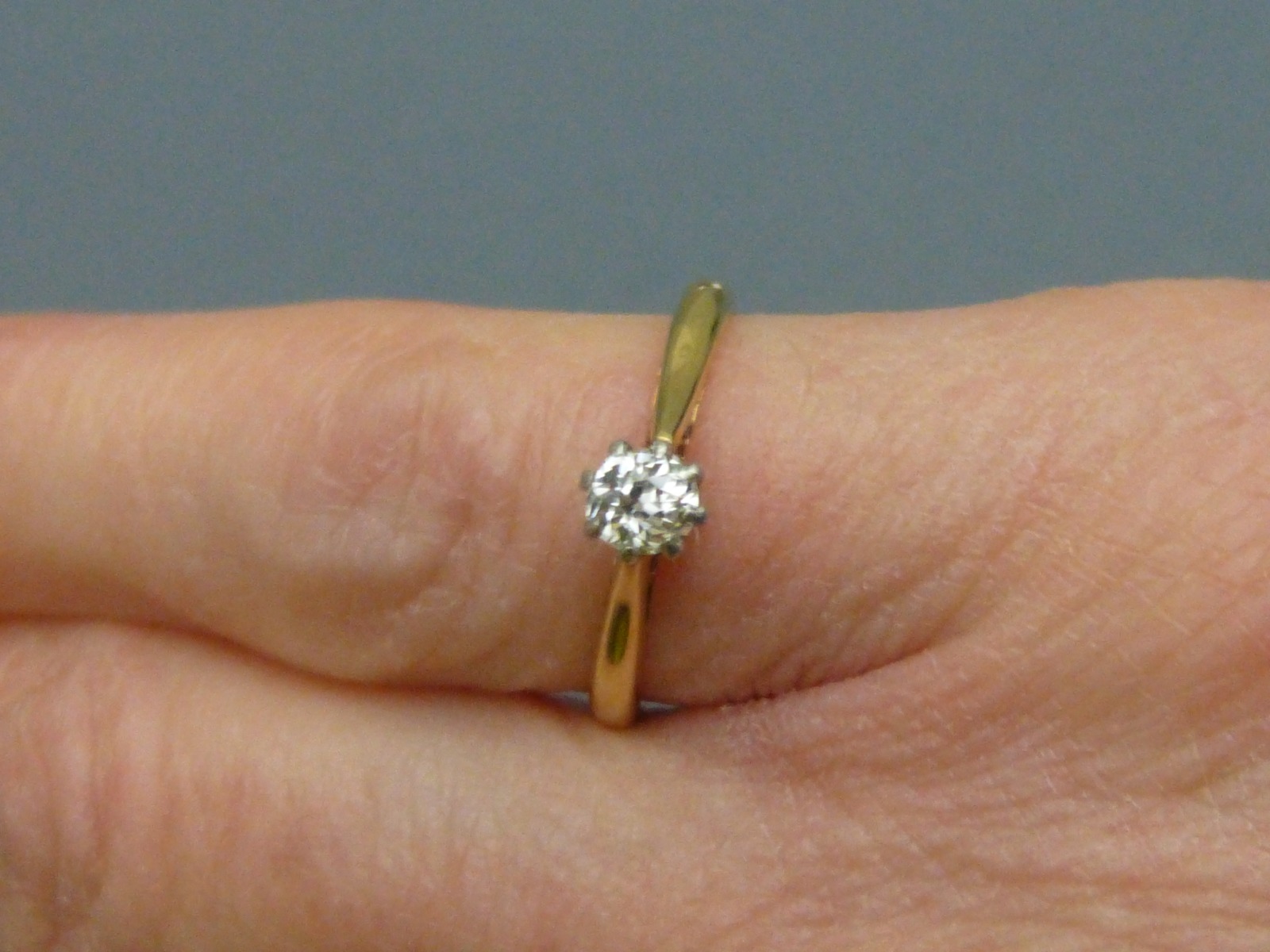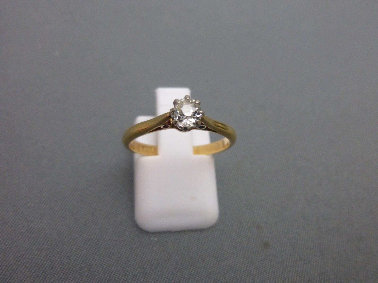 For sale is this 1930s, 18ct gold and diamond solitaire ring, stamped 18ct and plat inside the shank. The Victorian old cut diamond is of approx. 1/4 ct. in weight and was mounted in the 1930s.The stone is vibrant and clean. UK ring size ‘M’. Supplied in a modern presentation box.nnPlease ring or e-mail with any further questions.