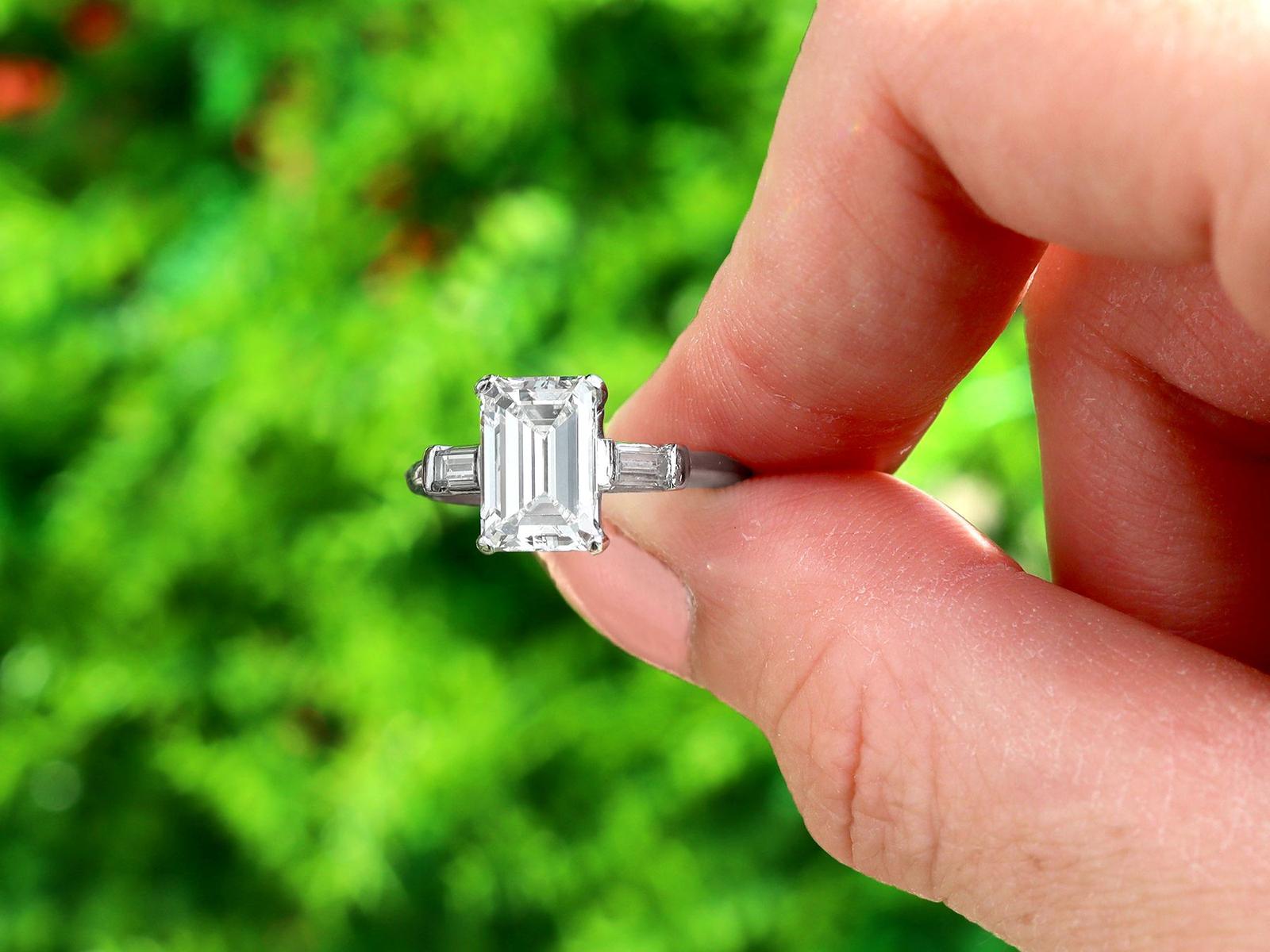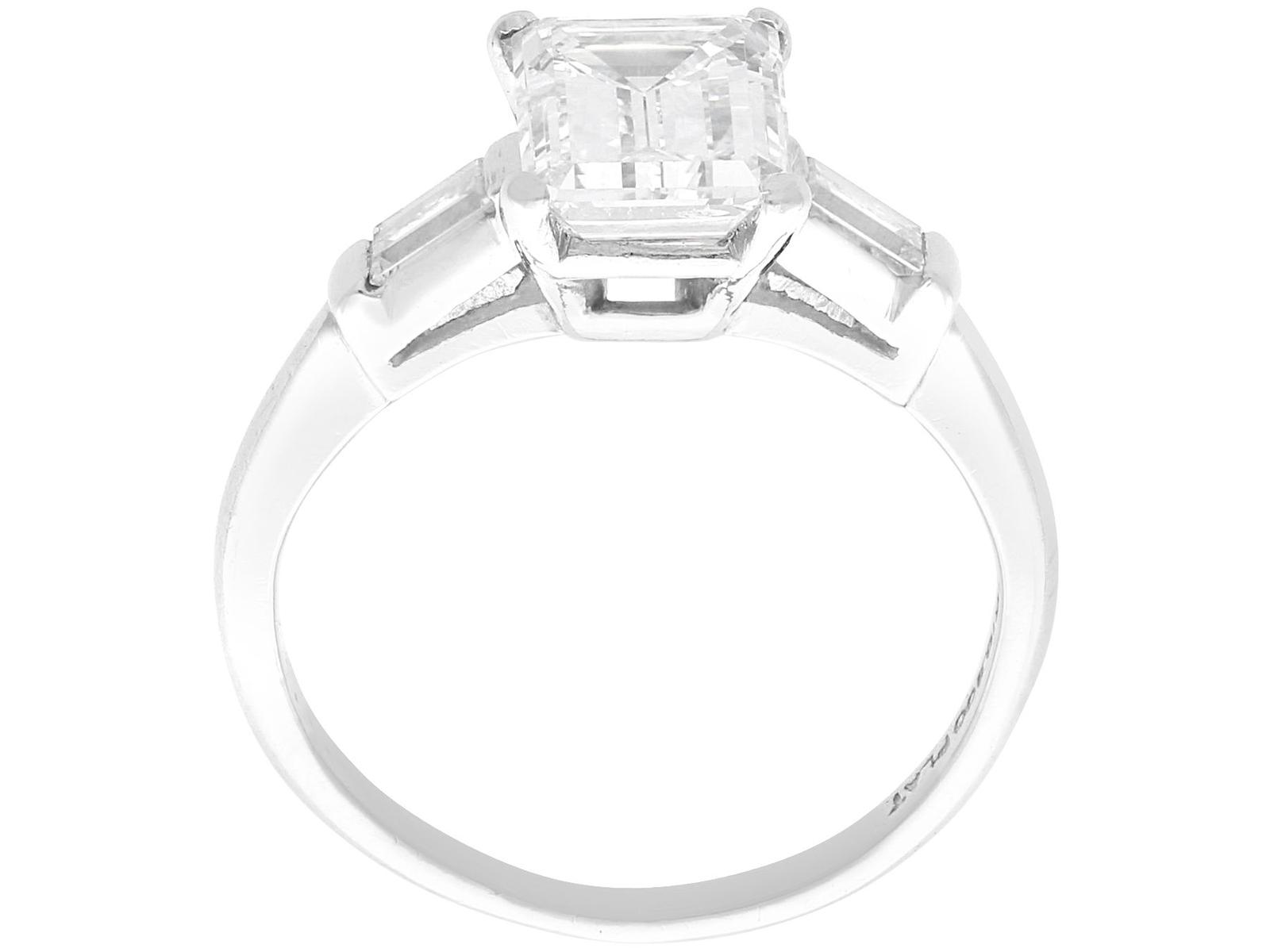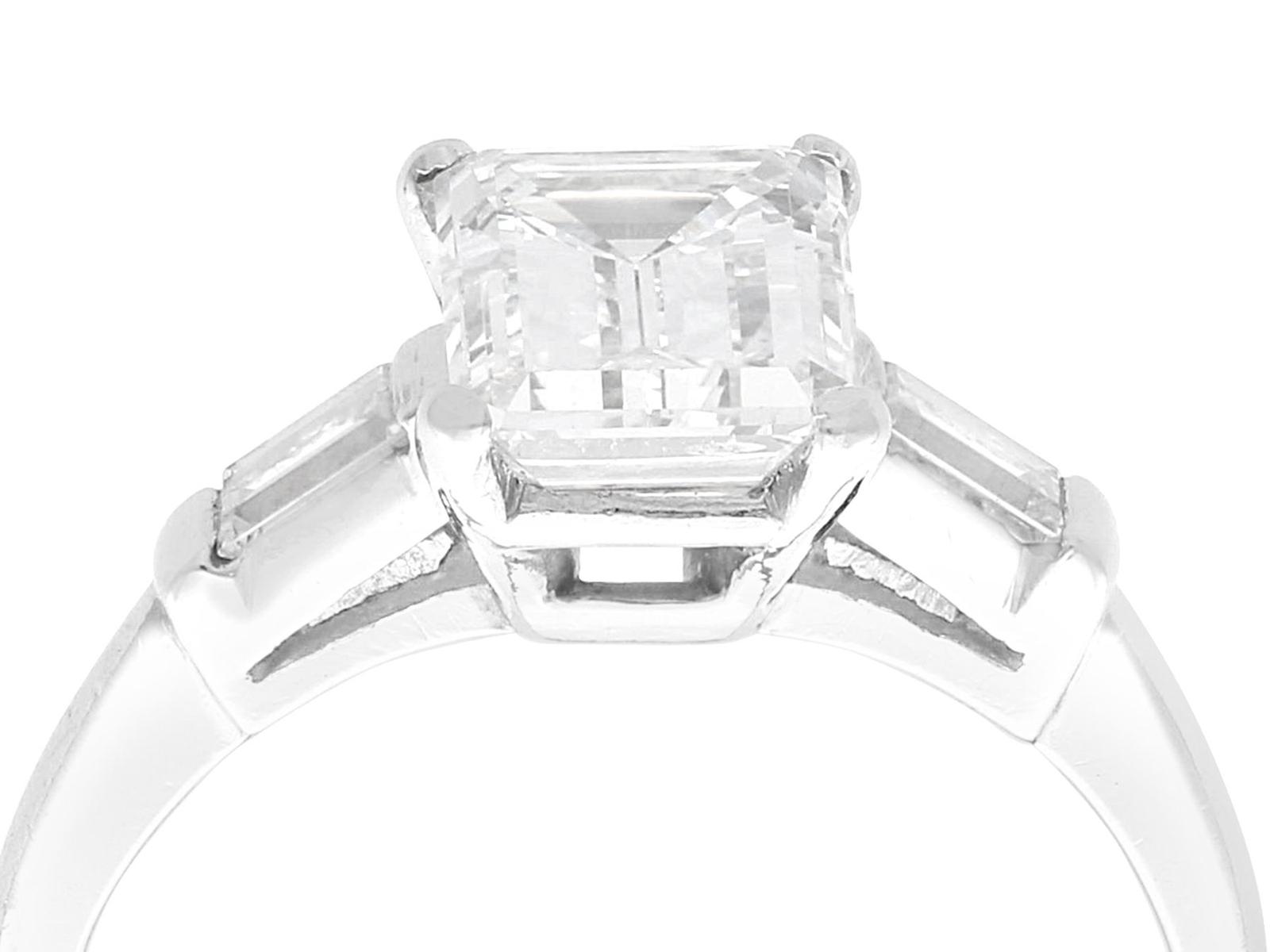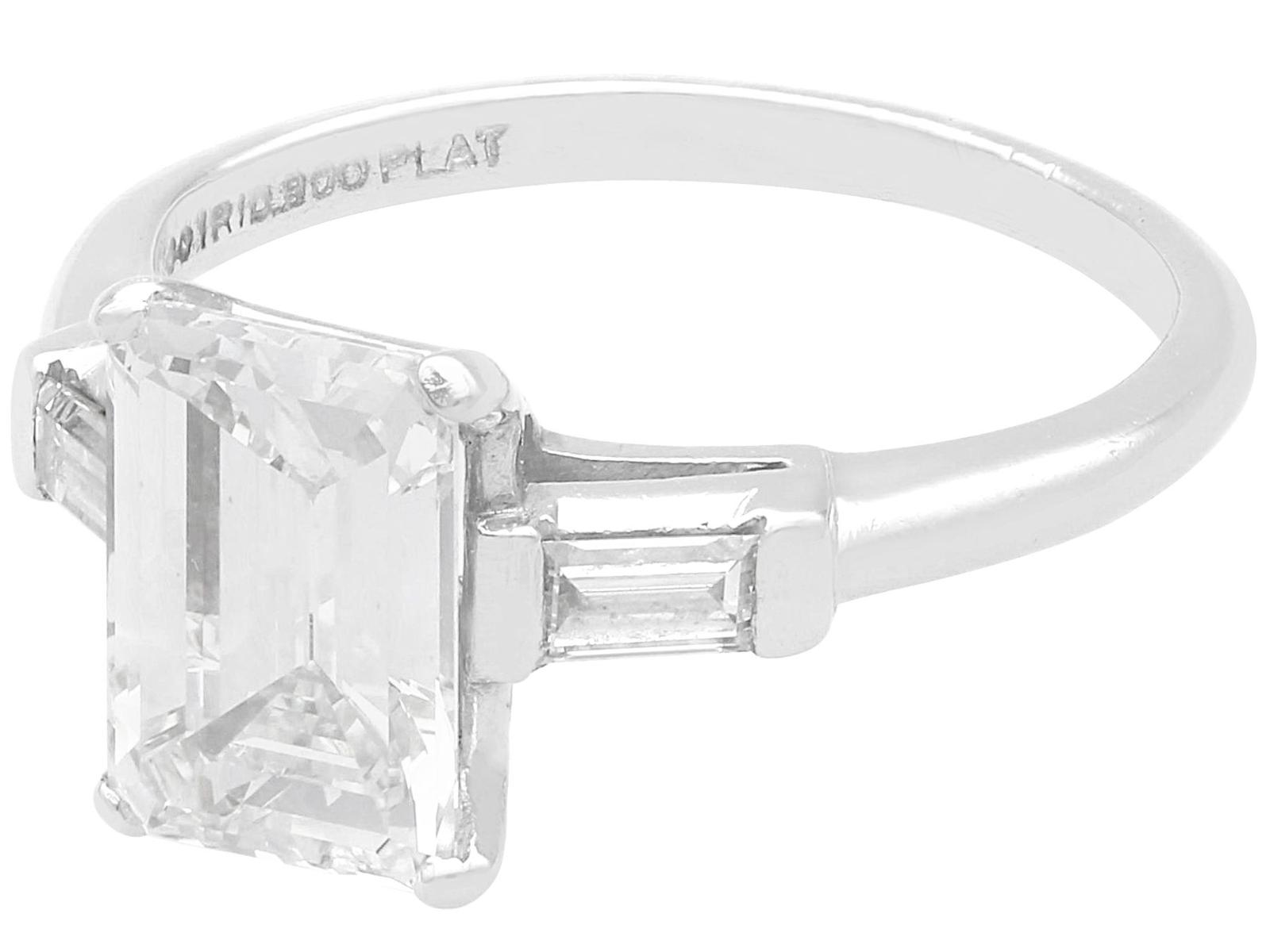 A stunning, fine and impressive antique 2.38 carat emerald cut diamond solitaire ring in platinum; part of our antique engagement ring collections.nnThis stunning, fine and impressive antique diamond ring has been crafted in platinum.nnThe pierced decorated setting is embellished with a stunning principal 2.06ct emerald cut diamond, four claw set in relief.nnThe emerald cut diamond setting is flanked with elevated ring shoulders, each embellished with a collet set baguette cut diamond, totalling 0.32 carat.nnThe shoulders integrate with the main setting and blend seamlessly with the plain hallmarked platinum shank.nnThe interior of the shank is hallmarked with the platinum mark (100 Irid 900 Plat).nnThis stunning antique platinum engagement ring is supplied with a European Diamond Report (Edr) certificate for the feature stone, in addition to an Idgl diamond grading report card for the supporting stones.nnImages do not always reflect the true colour and brilliance of gemstones and diamonds. The video however provides a truer representation of the actual colour and showcases each stone.nnDiamond QualitynFeature DiamondnColour InClarity Vs2nCut EmeraldnContent 2.06 caratsnDimensions 9.38mm (length) x 6.32mm (width) x 3.96mm (depth)nnSupporting DiamondsnColour (average grades) HnClarity (average grades) Vs1nCut BaguettenContent 0.32 caratnnTotal Diamond Contentn2.38 caratsnnNumber of Diamondsn3nnDimensionsnHeight of setting 5.65mm/0.22’nnRing SizenUK Size K 1/2nUSA Size 5 3/8nnThe ring size may be professionally adjusted in size on request to meet your personal requirements.nnWeightn4.26 grams