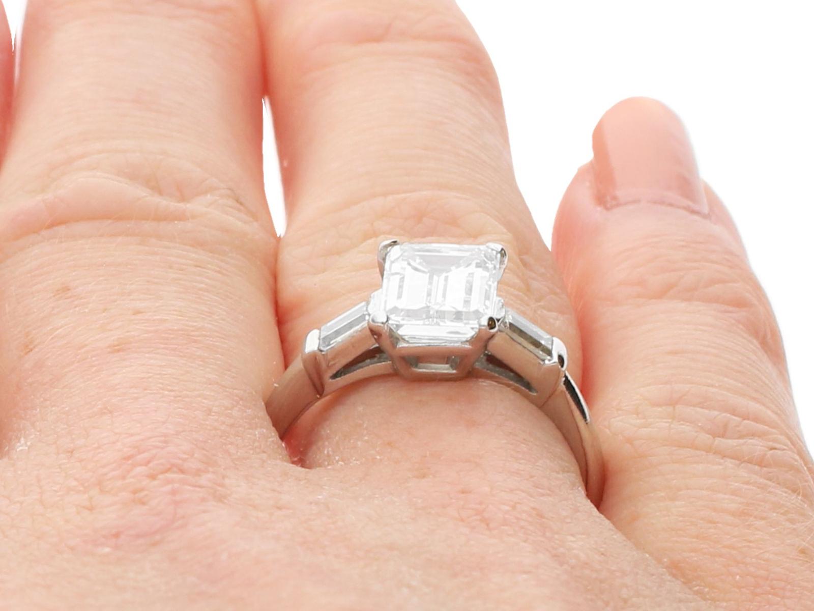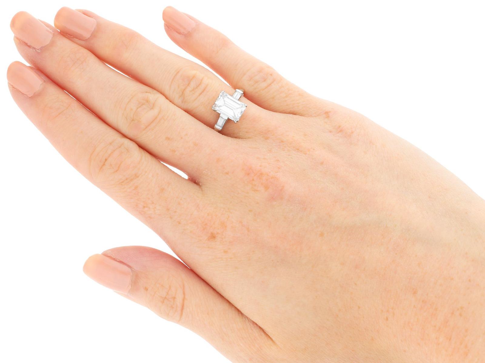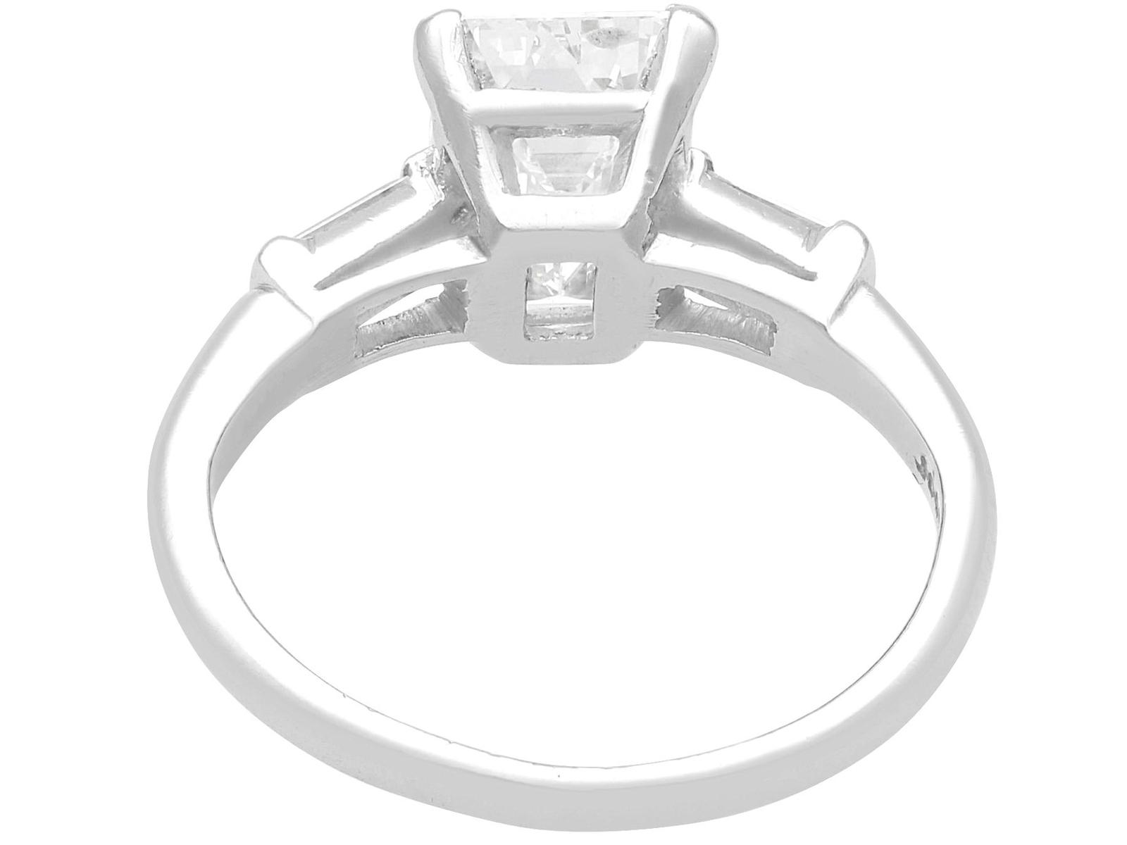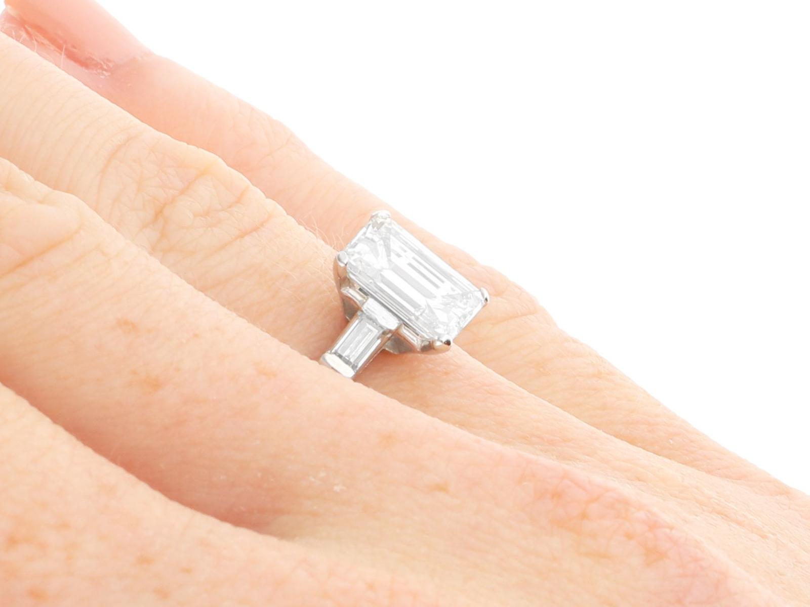 A stunning, fine and impressive antique 2.38 carat emerald cut diamond solitaire ring in platinum; part of our antique engagement ring collections.nnThis stunning, fine and impressive antique diamond ring has been crafted in platinum.nnThe pierced decorated setting is embellished with a stunning principal 2.06ct emerald cut diamond, four claw set in relief.nnThe emerald cut diamond setting is flanked with elevated ring shoulders, each embellished with a collet set baguette cut diamond, totalling 0.32 carat.nnThe shoulders integrate with the main setting and blend seamlessly with the plain hallmarked platinum shank.nnThe interior of the shank is hallmarked with the platinum mark (100 Irid 900 Plat).nnThis stunning antique platinum engagement ring is supplied with a European Diamond Report (Edr) certificate for the feature stone, in addition to an Idgl diamond grading report card for the supporting stones.nnImages do not always reflect the true colour and brilliance of gemstones and diamonds. The video however provides a truer representation of the actual colour and showcases each stone.nnDiamond QualitynFeature DiamondnColour InClarity Vs2nCut EmeraldnContent 2.06 caratsnDimensions 9.38mm (length) x 6.32mm (width) x 3.96mm (depth)nnSupporting DiamondsnColour (average grades) HnClarity (average grades) Vs1nCut BaguettenContent 0.32 caratnnTotal Diamond Contentn2.38 caratsnnNumber of Diamondsn3nnDimensionsnHeight of setting 5.65mm/0.22’nnRing SizenUK Size K 1/2nUSA Size 5 3/8nnThe ring size may be professionally adjusted in size on request to meet your personal requirements.nnWeightn4.26 grams