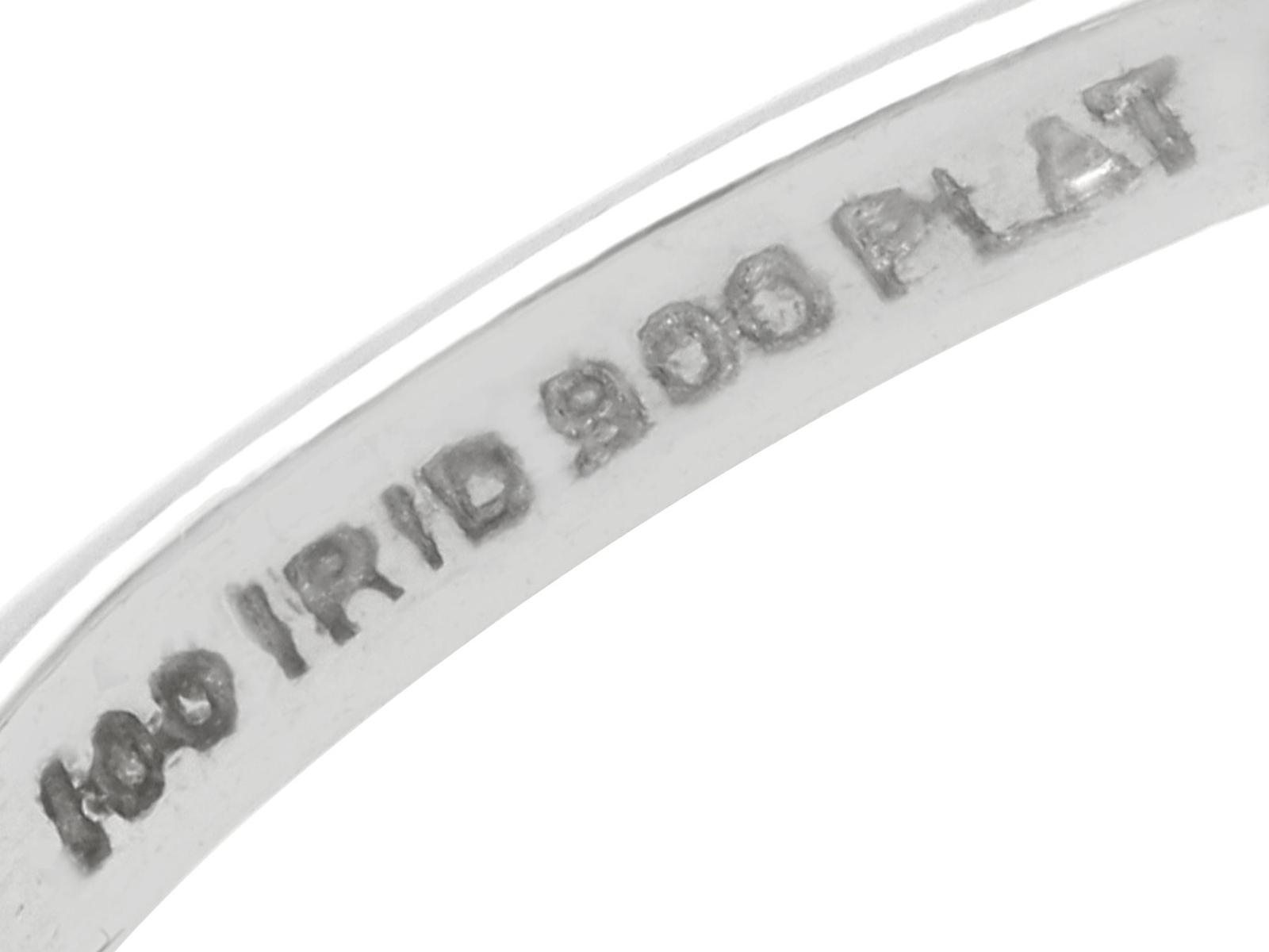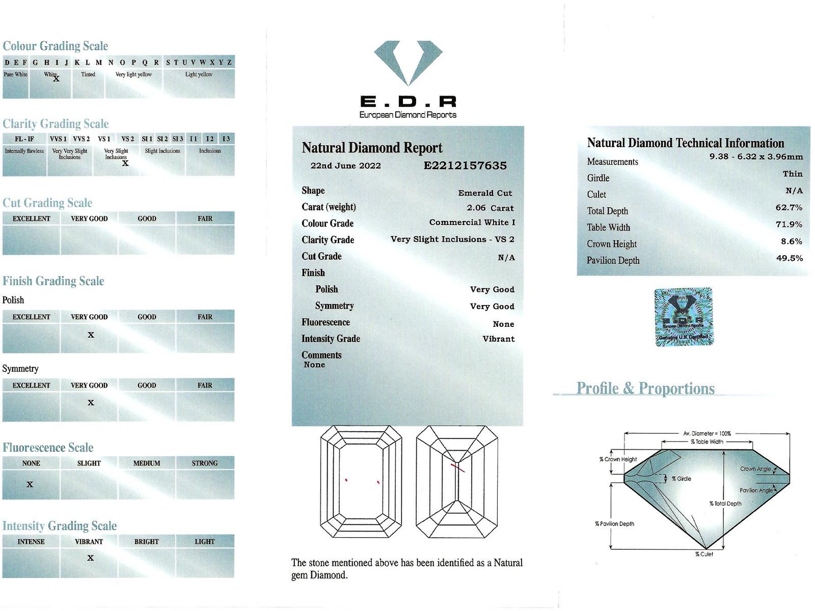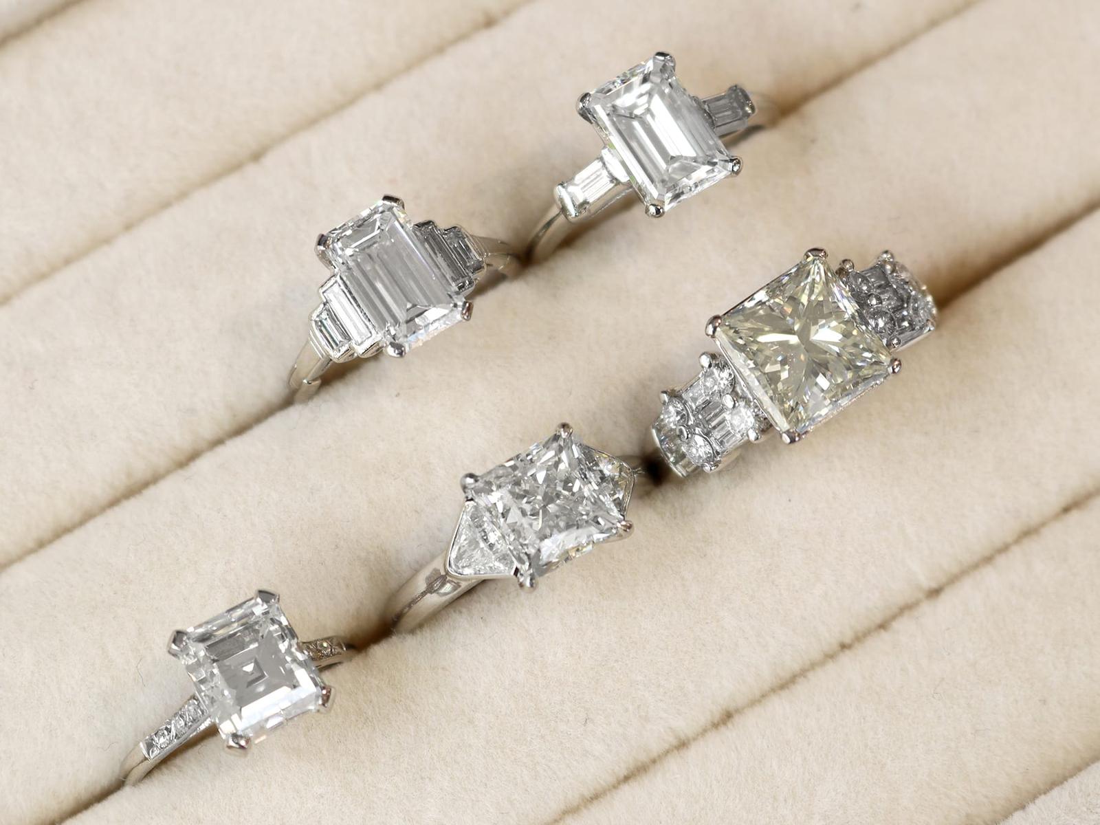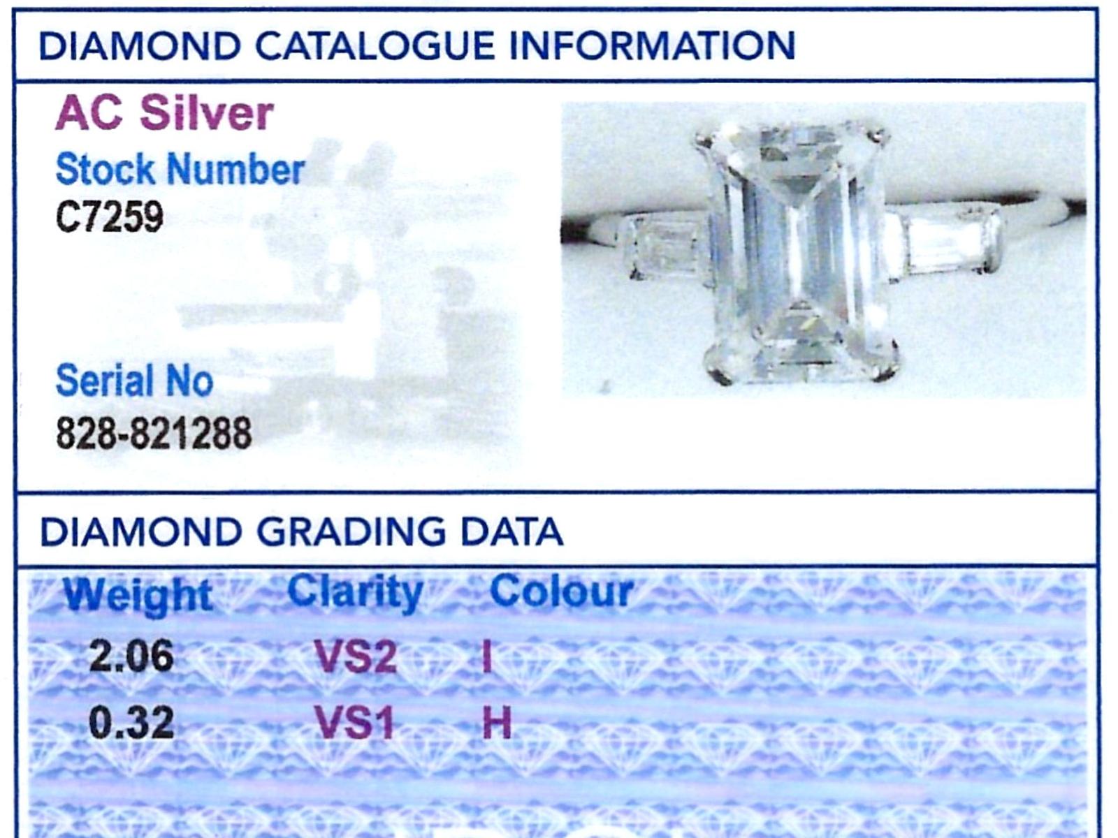 A stunning, fine and impressive antique 2.38 carat emerald cut diamond solitaire ring in platinum; part of our antique engagement ring collections.nnThis stunning, fine and impressive antique diamond ring has been crafted in platinum.nnThe pierced decorated setting is embellished with a stunning principal 2.06ct emerald cut diamond, four claw set in relief.nnThe emerald cut diamond setting is flanked with elevated ring shoulders, each embellished with a collet set baguette cut diamond, totalling 0.32 carat.nnThe shoulders integrate with the main setting and blend seamlessly with the plain hallmarked platinum shank.nnThe interior of the shank is hallmarked with the platinum mark (100 Irid 900 Plat).nnThis stunning antique platinum engagement ring is supplied with a European Diamond Report (Edr) certificate for the feature stone, in addition to an Idgl diamond grading report card for the supporting stones.nnImages do not always reflect the true colour and brilliance of gemstones and diamonds. The video however provides a truer representation of the actual colour and showcases each stone.nnDiamond QualitynFeature DiamondnColour InClarity Vs2nCut EmeraldnContent 2.06 caratsnDimensions 9.38mm (length) x 6.32mm (width) x 3.96mm (depth)nnSupporting DiamondsnColour (average grades) HnClarity (average grades) Vs1nCut BaguettenContent 0.32 caratnnTotal Diamond Contentn2.38 caratsnnNumber of Diamondsn3nnDimensionsnHeight of setting 5.65mm/0.22’nnRing SizenUK Size K 1/2nUSA Size 5 3/8nnThe ring size may be professionally adjusted in size on request to meet your personal requirements.nnWeightn4.26 grams