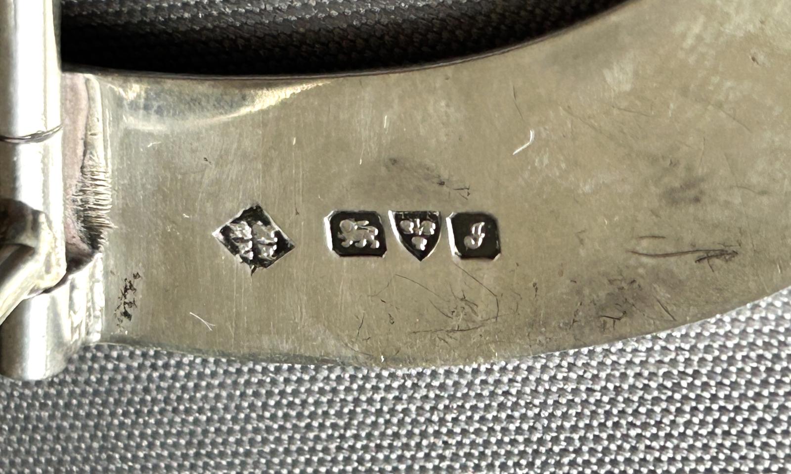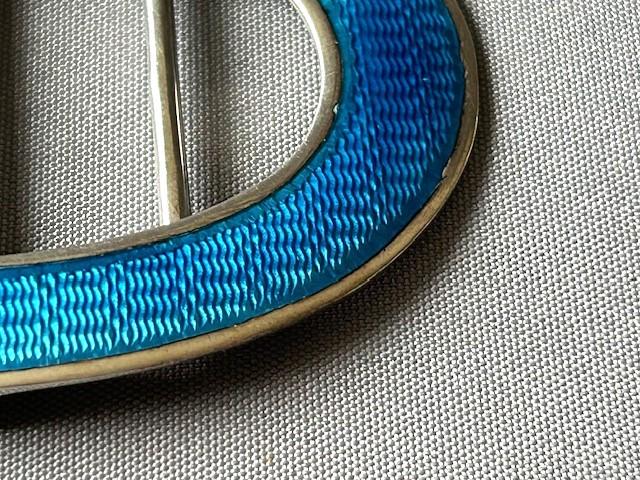 A stunning piece of craftsmanship, this heavy silver belt buckle is decorated with a thick band of vibrant blue guilloche enamel. The hinged clasp moves very smoothly and, unusually, is separately hallmarked to both claw and bar. nnAssayed at the sought after Chester Office, this is a high quality buckle from the Art Nouveau period and a superb collector’s piece, with a practical use.