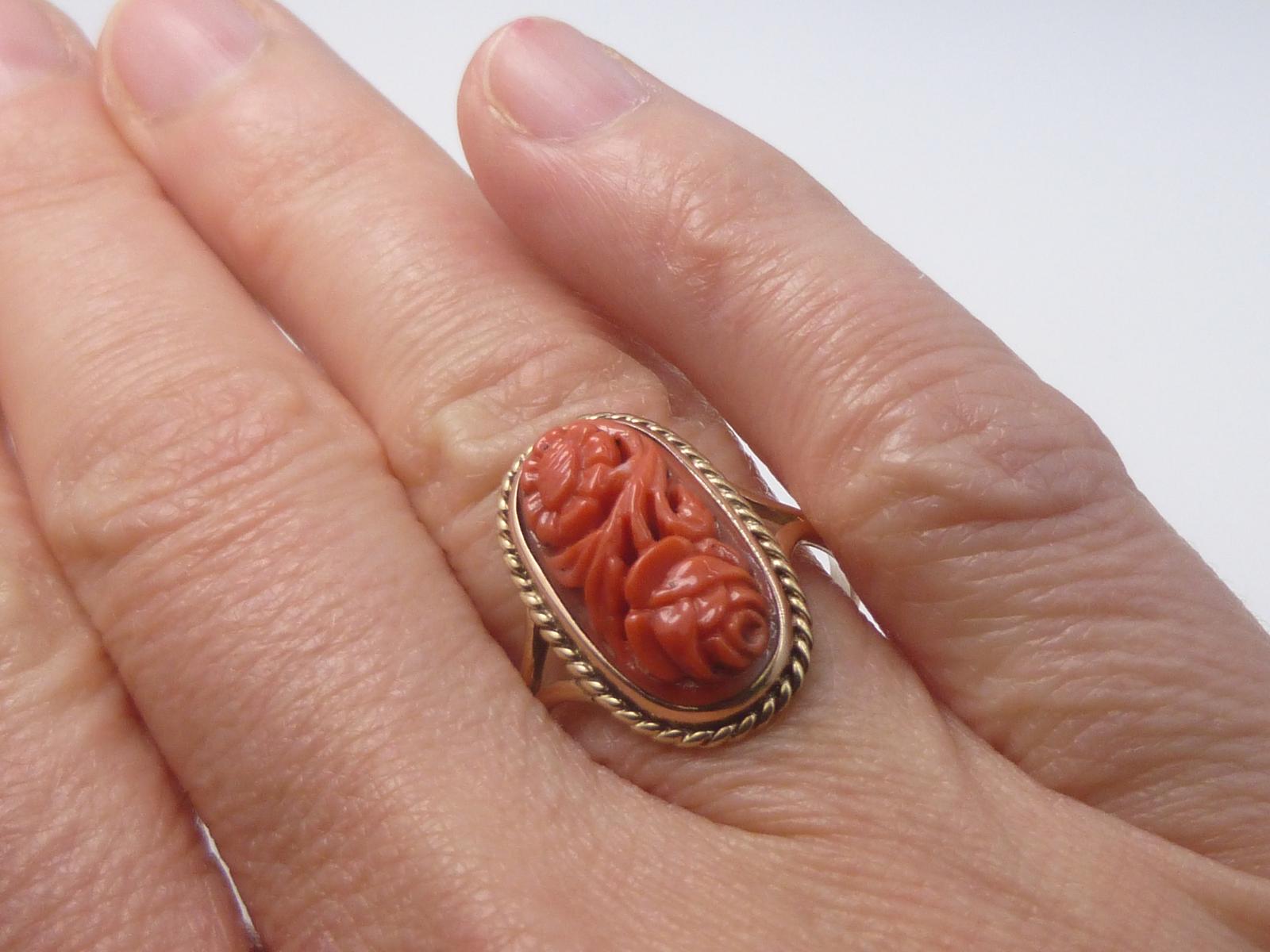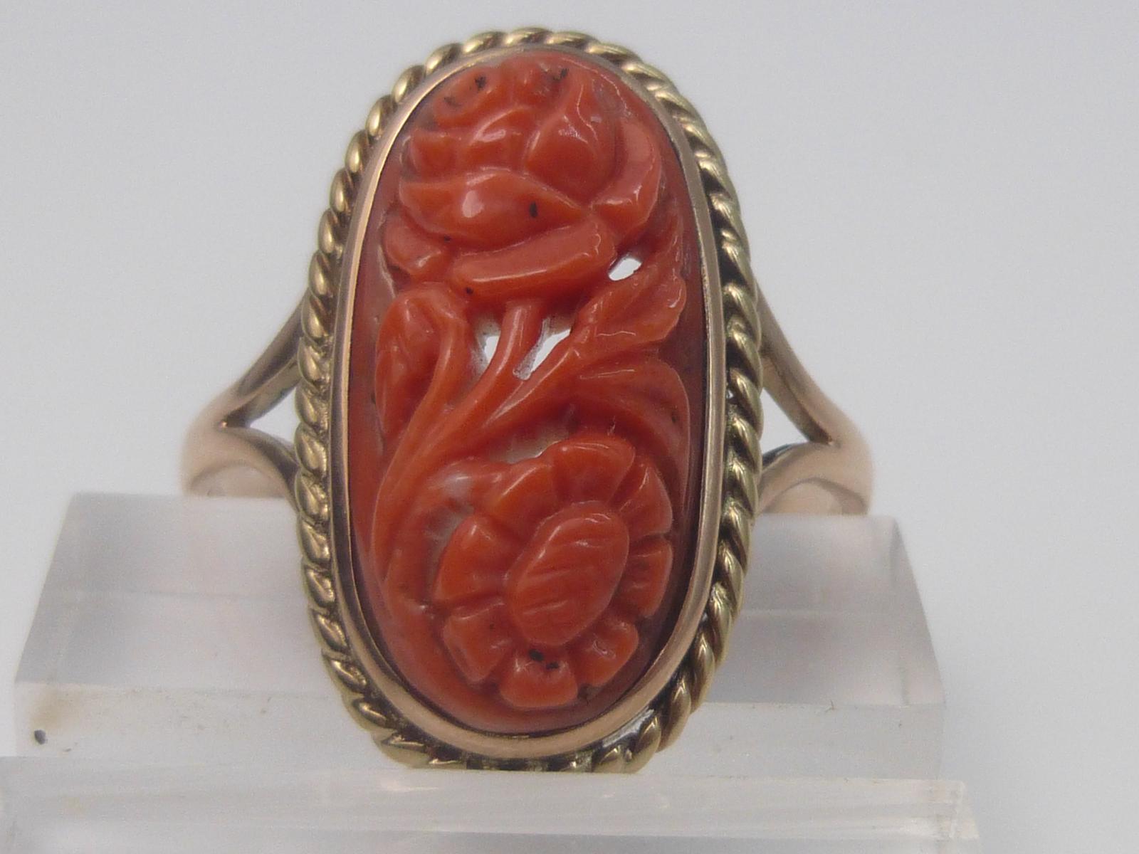 9ct gold and coral ring, stamped 9ct inside the hoop, UK ring size