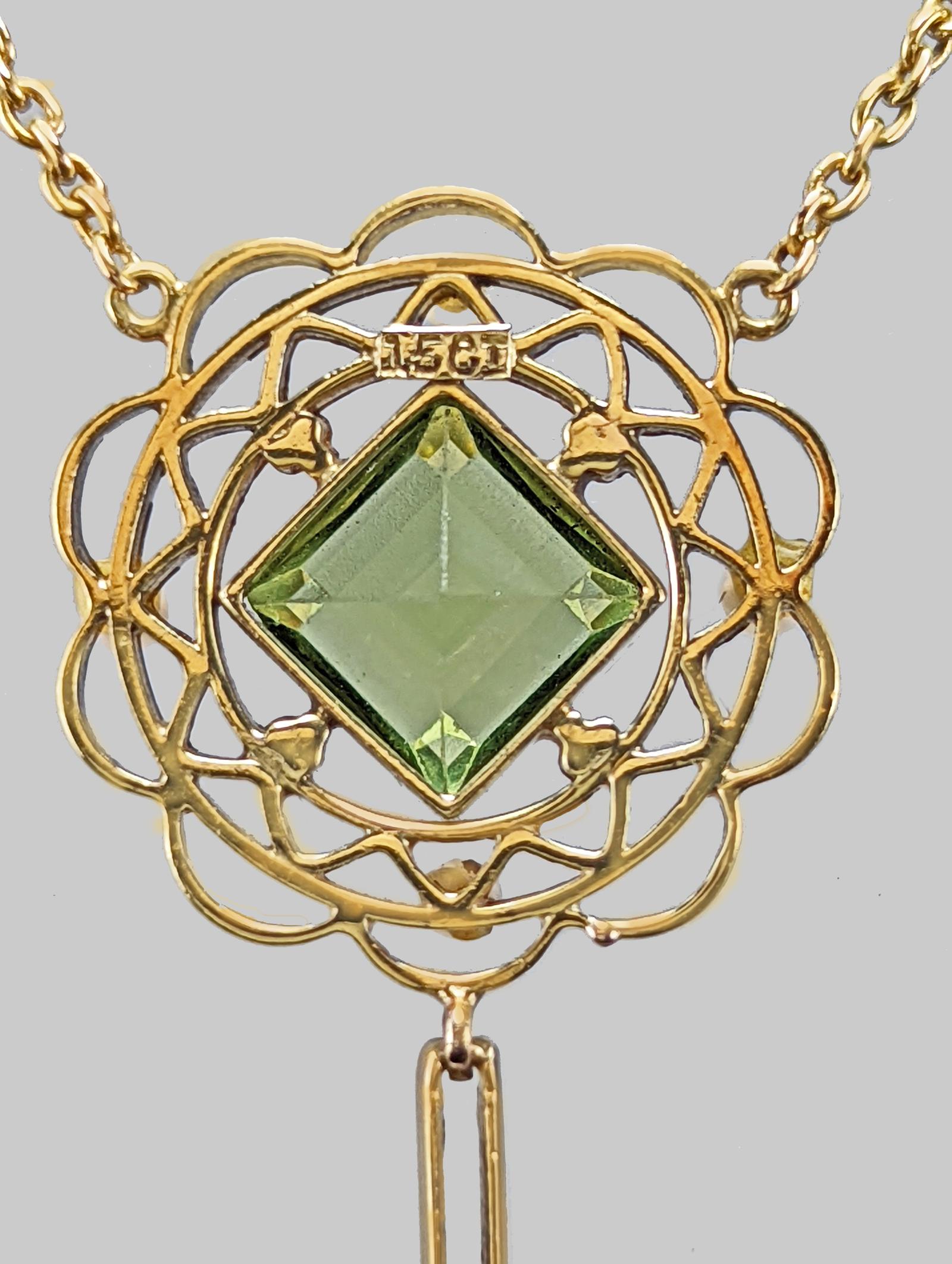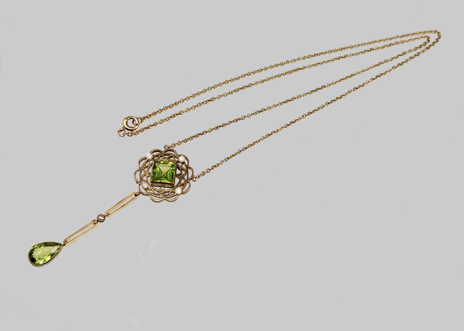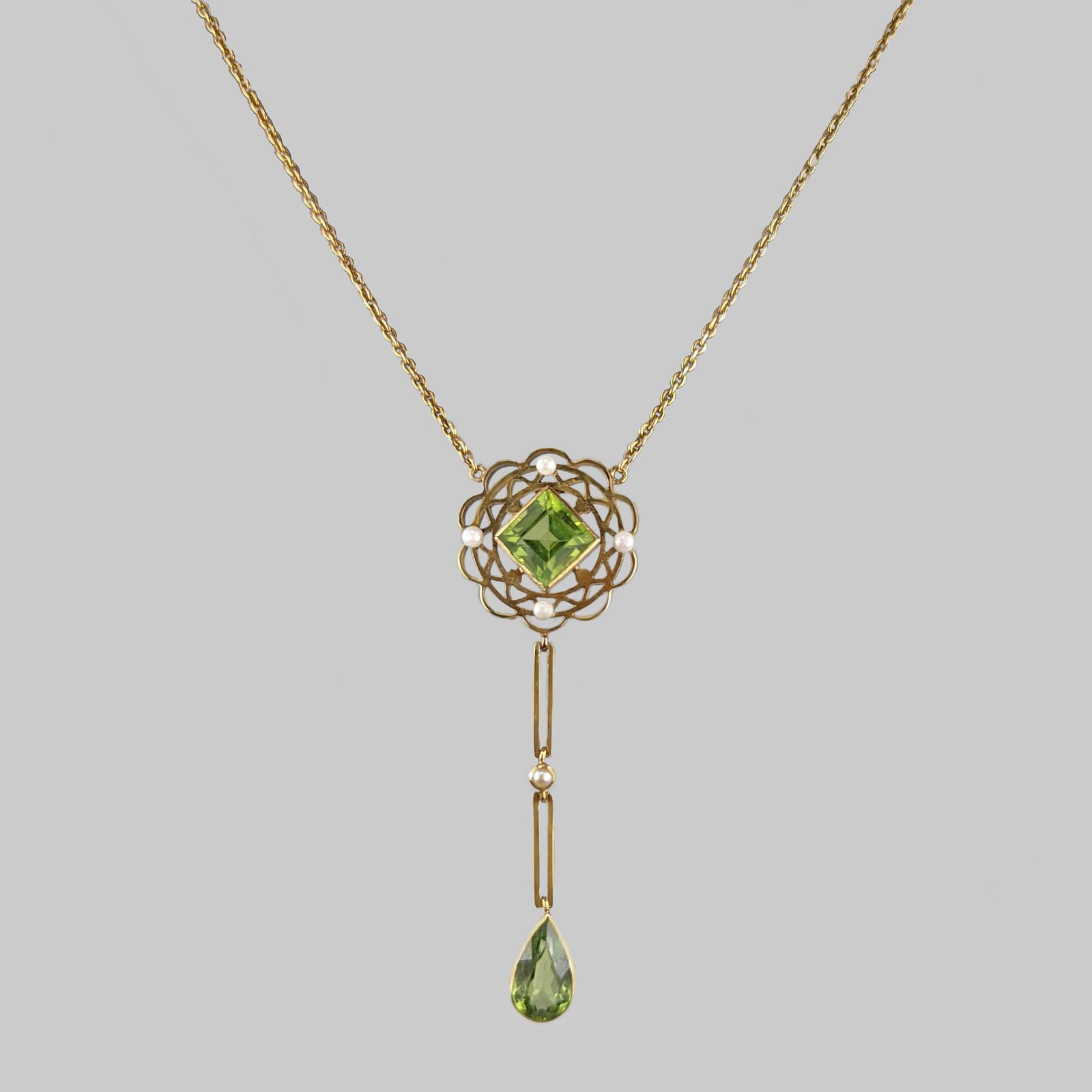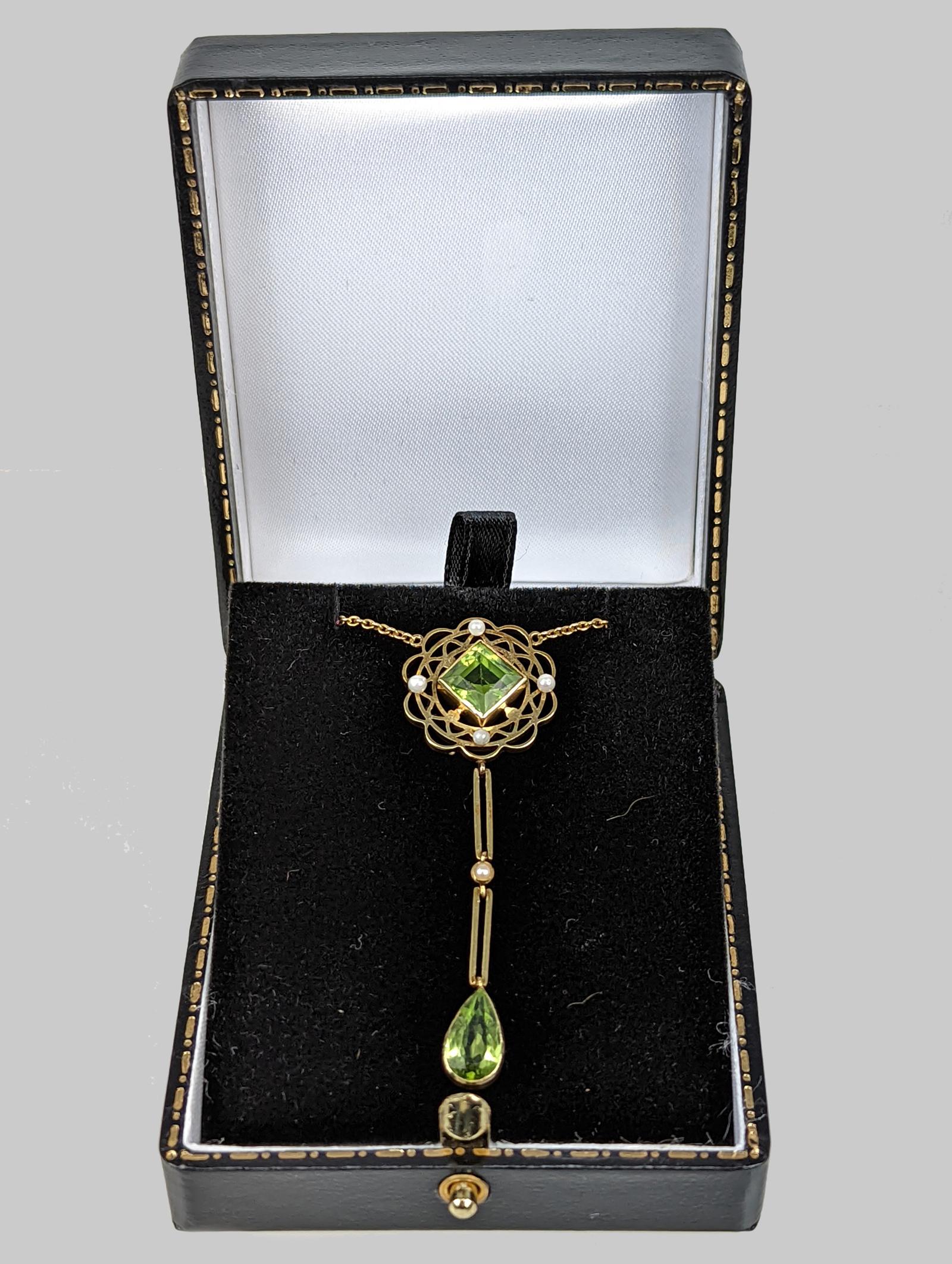 Gorgeous Edwardian peridot and pearl necklacennBeautifully designed this necklace is hand crafted in 15ct goldnnFeaturing a step cut peridot with split pearls to the corners, within a circular pierced openwork plaque. Suspended below are two rectangular chain links spaced by a split pearl and terminating with a pear shaped peridot.nnThe integral trace link chain fastens with a traditional spring ring claspnnThis fabulous necklace looks stunning when wornnnPendant Drop 5.8mm and width 18mm (2.2