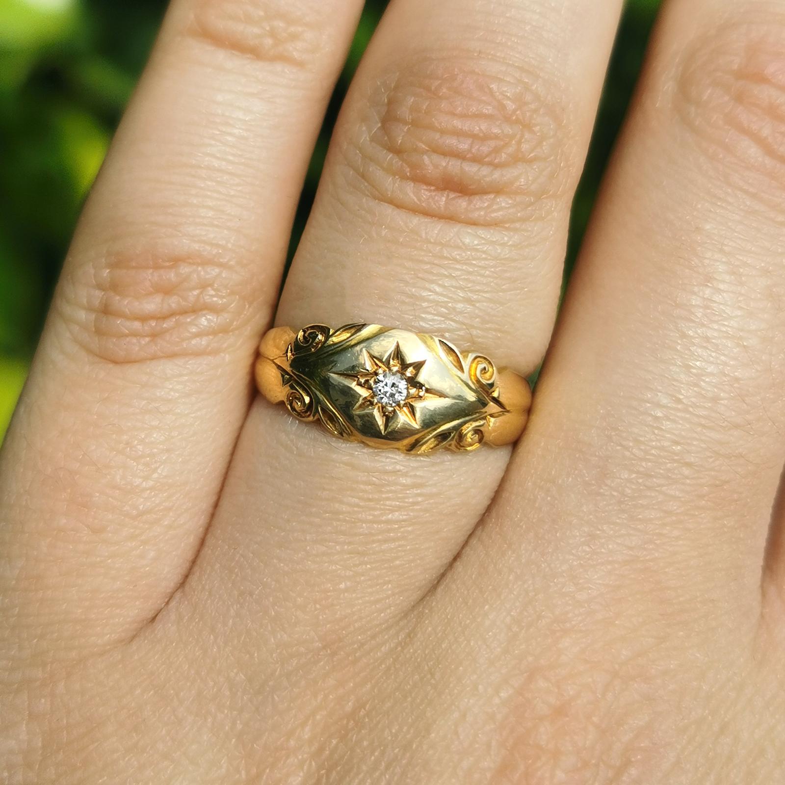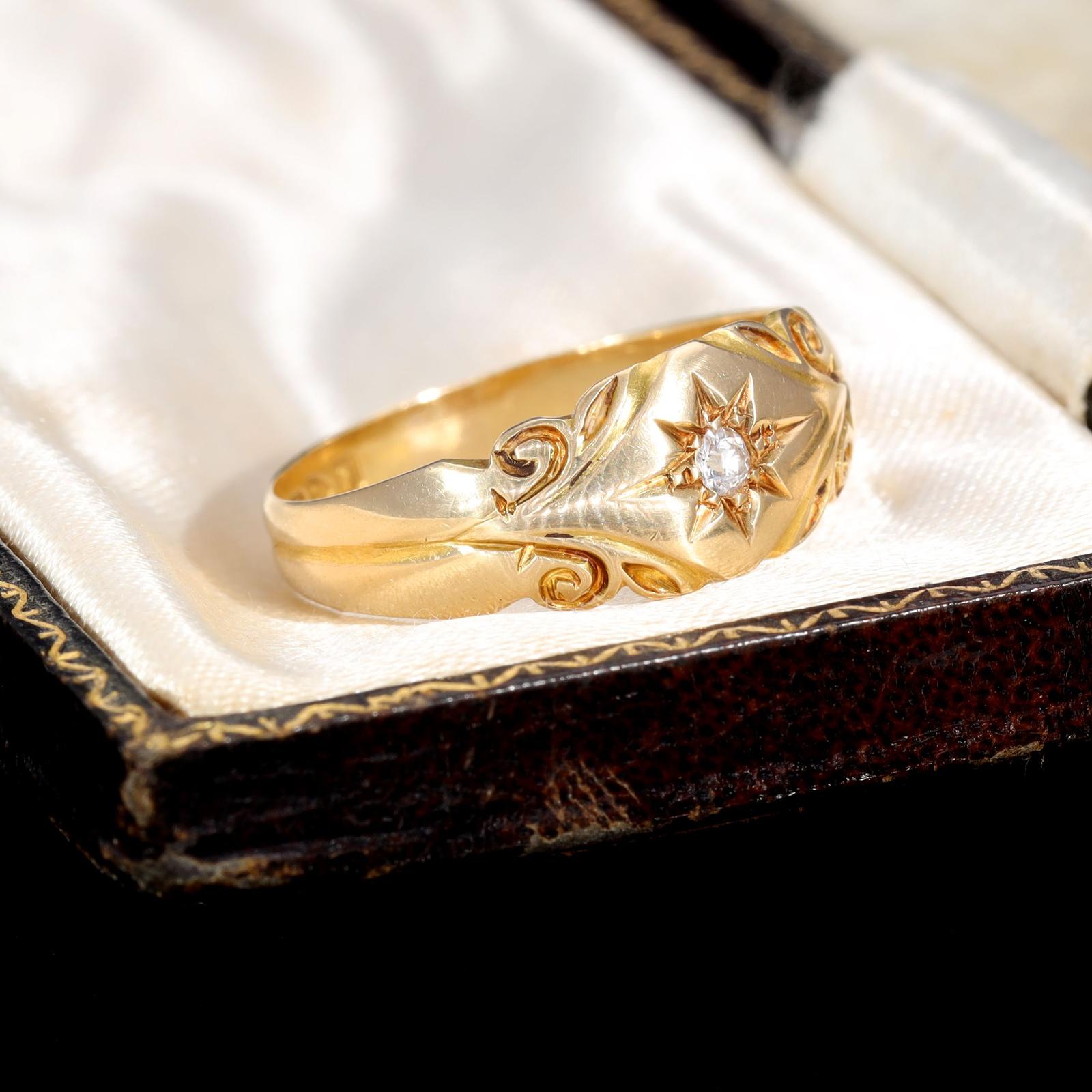 This gorgeous ring features a wide band centering on a star-shaped setting, filled with an incredible old European cut diamond for an approximate total of 0.06ct. The kite-shaped head is adorned with scrollwork to each side and the ridged shoulders leads along the entirety of the band.nnThis ring is fully hallmarked by the Assay Office of Chester for 18ct gold in 1906. It is in good condition with light marks commensurate with age.nnPlease find the Expert Report, (see the end image in the gallery) for more detailed information.nnEstimated diamond colour: G-HnEstimated diamond clarity: Si