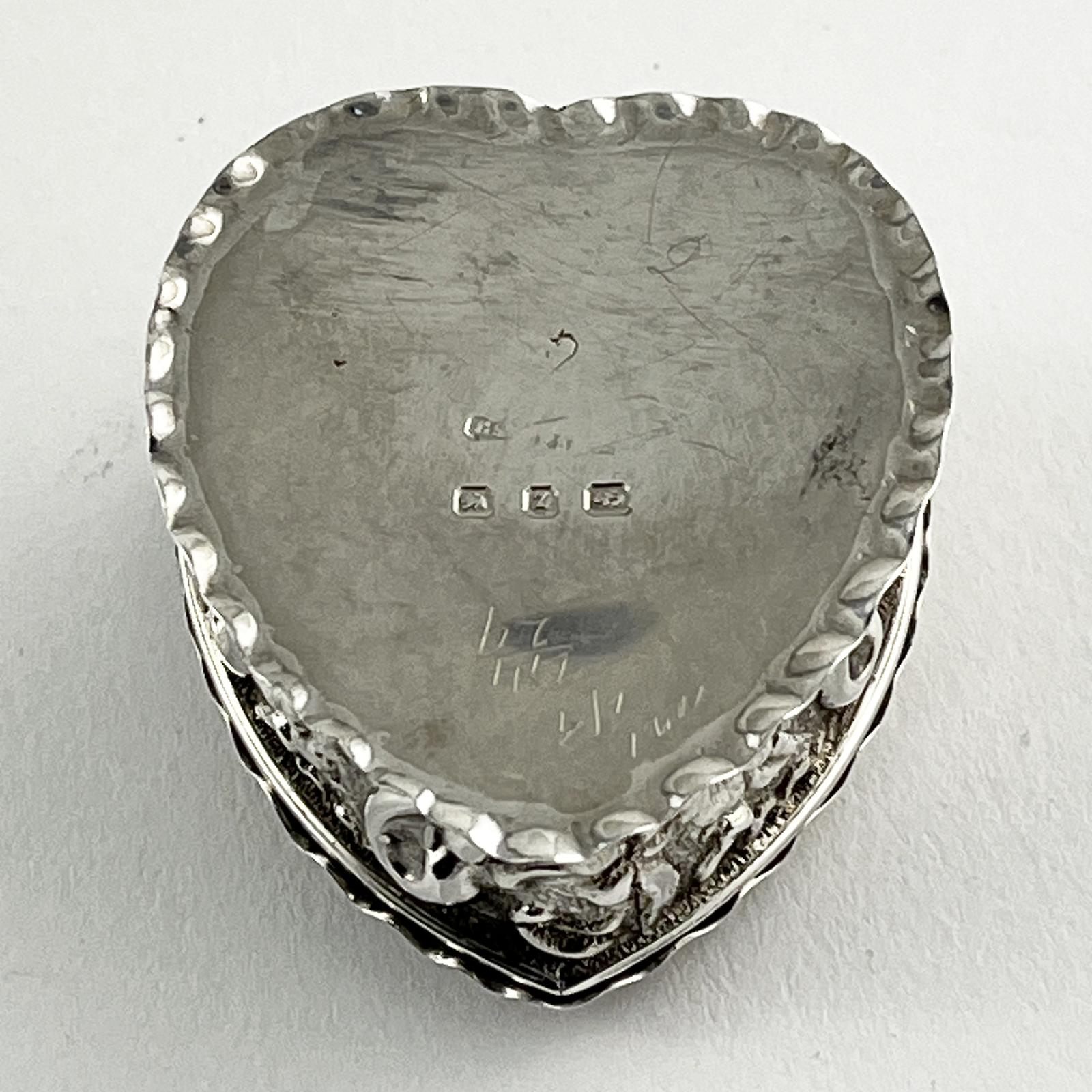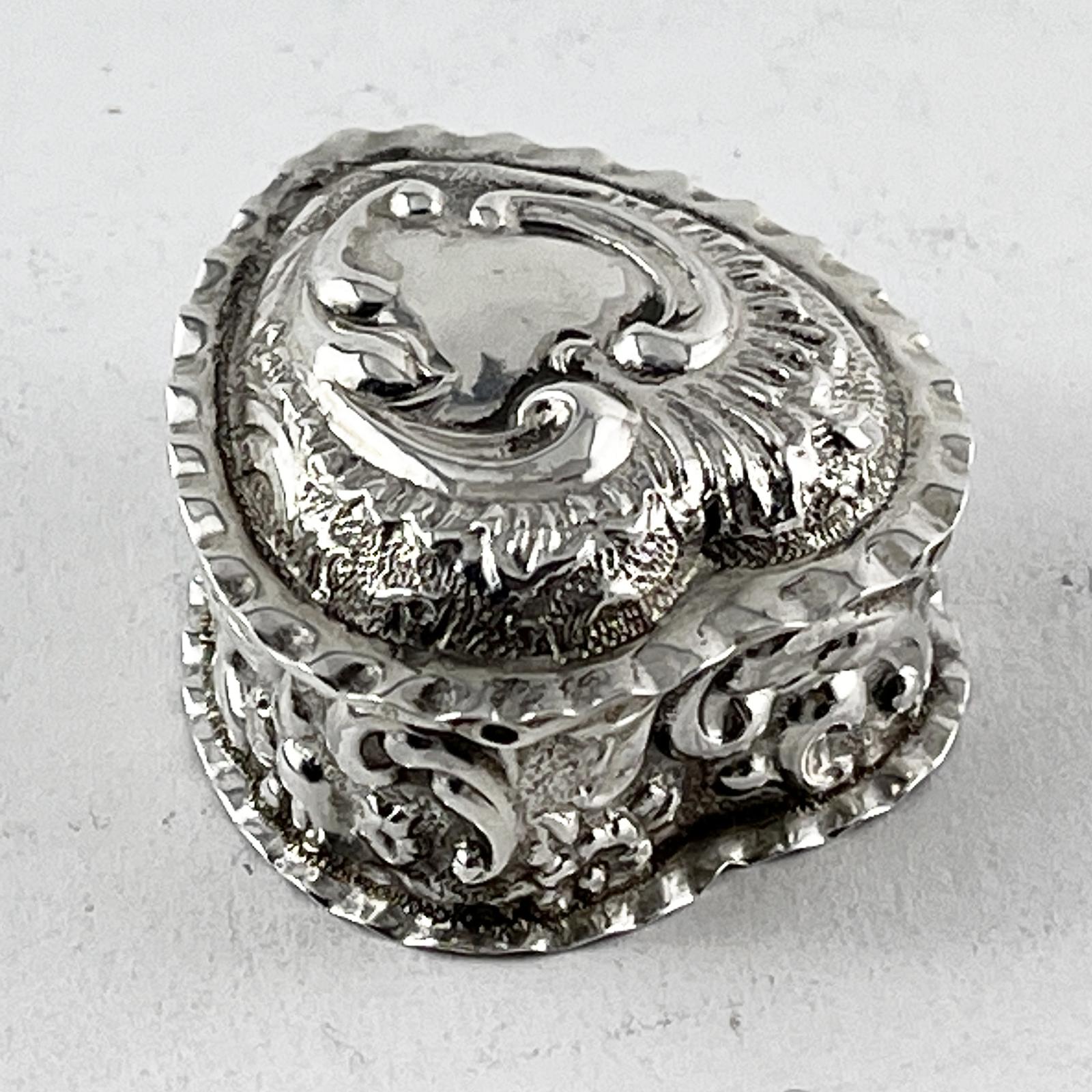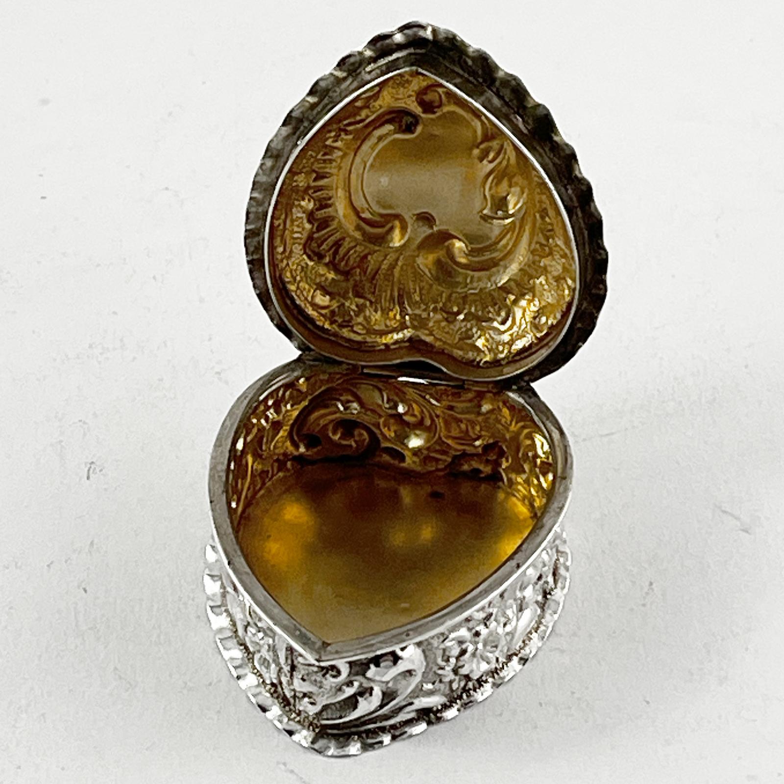 A very charming Victorian (1899) sterling silver ring or jewellery box. Heart shaped with a hinged embossed floral lid and empty cartouche. The body has a gilt interior with floral and scroll embossing.